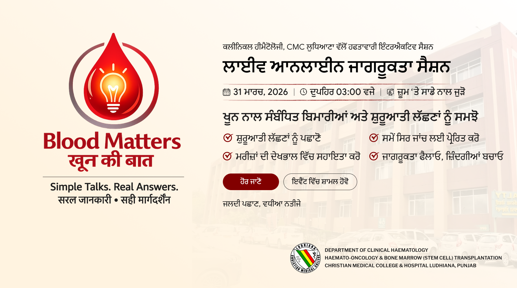 ਕ੍ਰਿਸਚੀਅਨ ਮੈਡੀਕਲ ਕਾਲਜ, ਲੁਧਿਆਣਾ ਦੇ ਕਲਿਨੀਕਲ ਹੀਮੈਟੋਲੋਜੀ ਵਿਭਾਗ ਵੱਲੋਂ ਇੱਕ ਸੌਖੀ ਪਰ ਪ੍ਰਭਾਵਸ਼ਾਲੀ ਪਹਿਲ ਪੇਸ਼ ਕੀਤੀ ਜਾ ਰਹੀ ਹੈ —